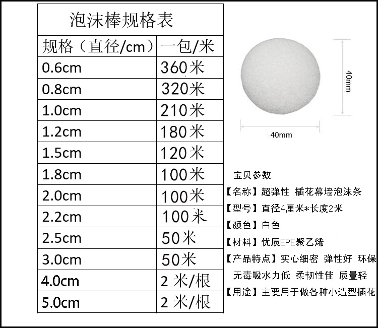 Diameter 6mm (a pack of 360 meters)Diameter 8mm(a pack of 320 meters)Diameter 10mm(a pack of 210 meters)Diameter 12mm(a pack of 360 meters)Diameter 15mm