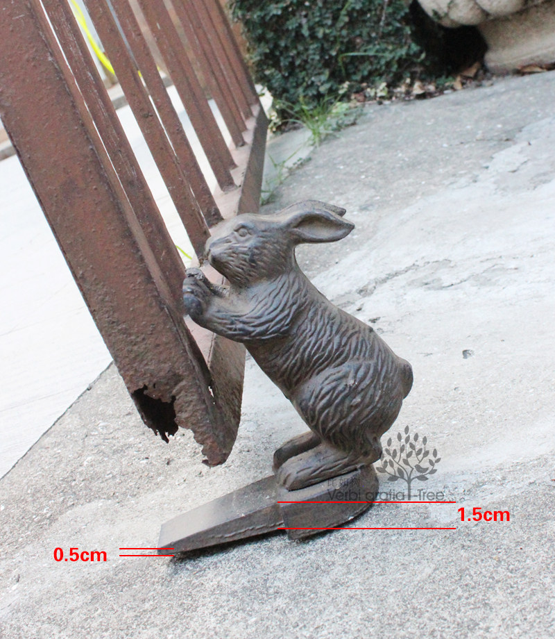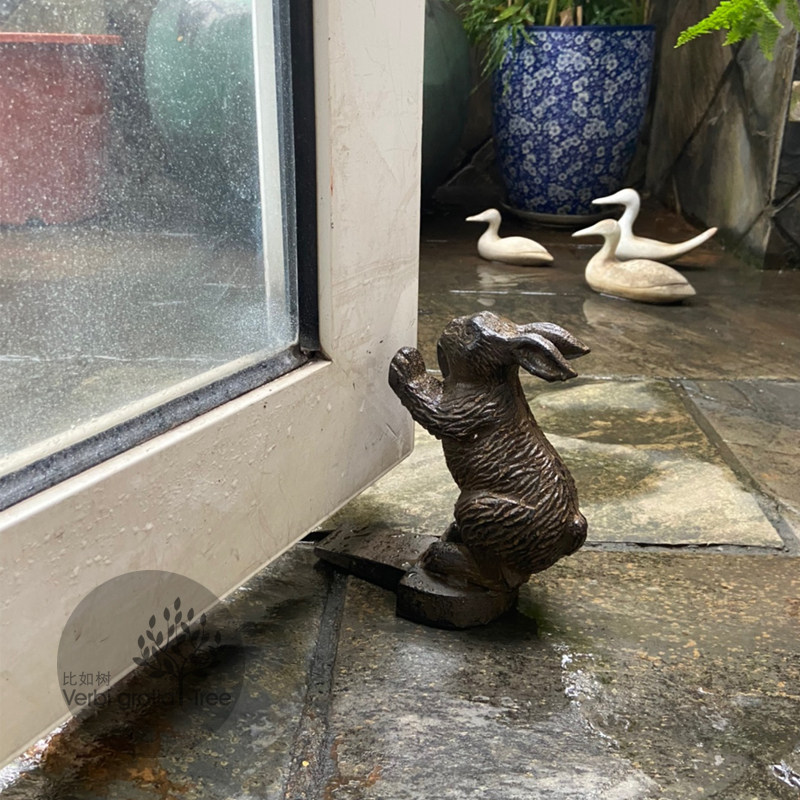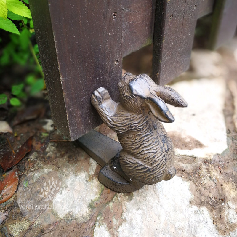 For example, the tree - outside the single cast iron old vintage cute rabbit puppy door blocking door wedge garden home American countryside