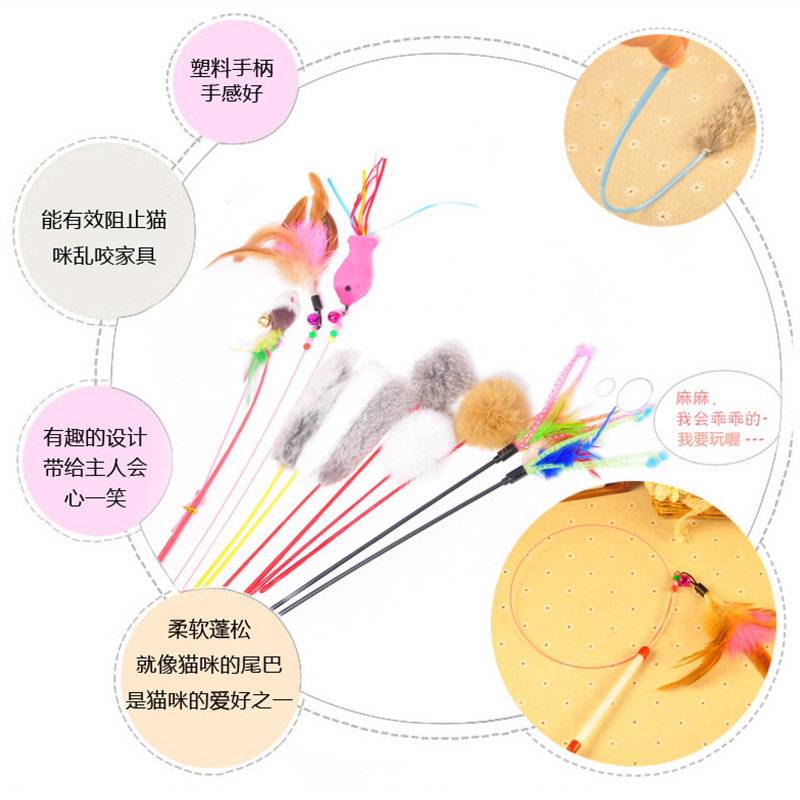Pet tease cat stick cat toy bell with sound ball toy long handle chicken feather mouse laser tease cat toy supplies
