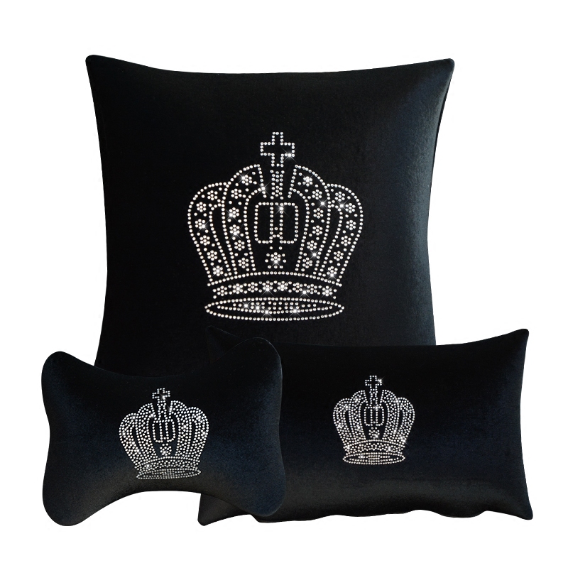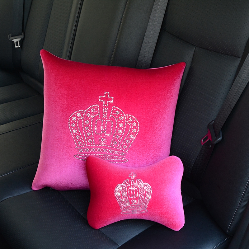 A pair of purple crown headrests A pair of pillows A rose red crown waist support A rose red crown headrest A pair of black crown headrests A pair of pillows A rose red crown pillow one Purple crown head