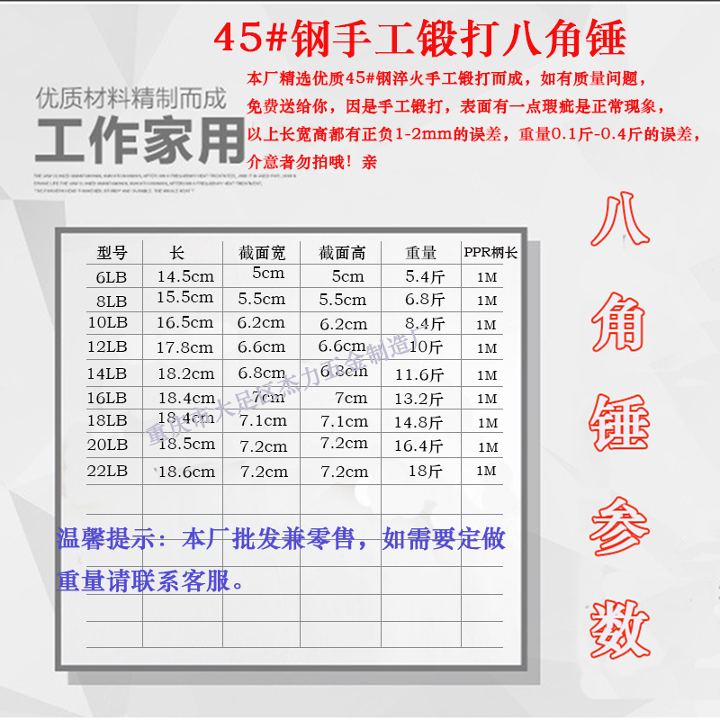 PPR with handle large iron hammer octagonal hammer sledgehammer stone hammer decoration hammer chisel wall hammer smash wall hammer fire hammer iron hammer