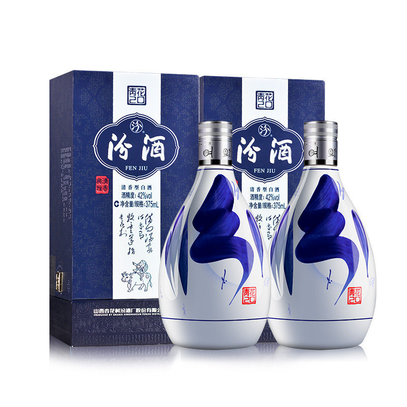 Shanxi Fenjiu 42 degrees blue and white 20 Fenjiu 375ml*2 bottles of boxed fragrance type domestic liquor