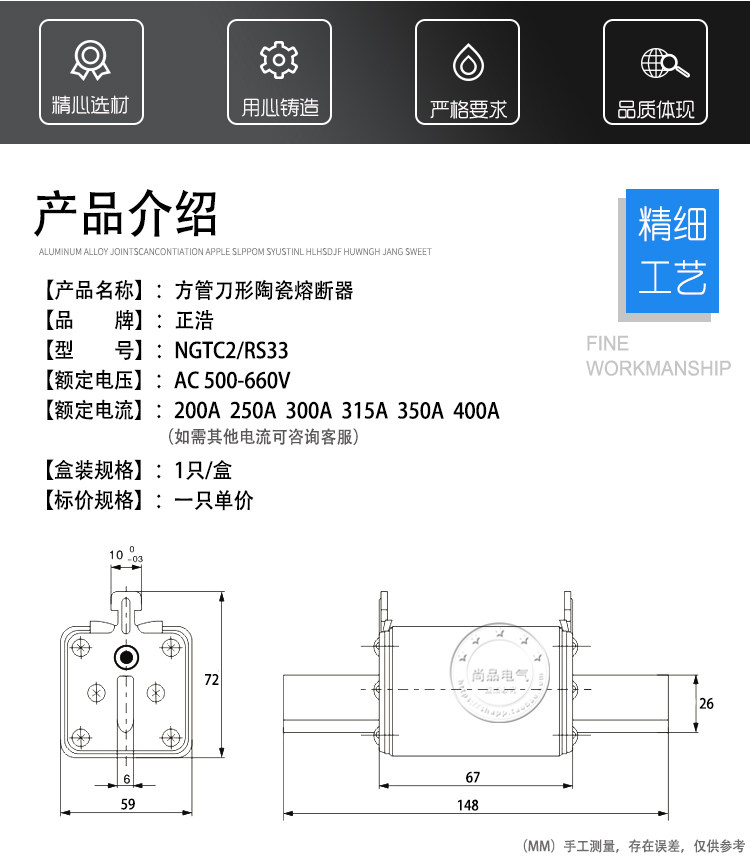 Zhenghao NGTC2 RS33 knife type ceramic fast fuse insurance 250A 300A 315A 350A 400A