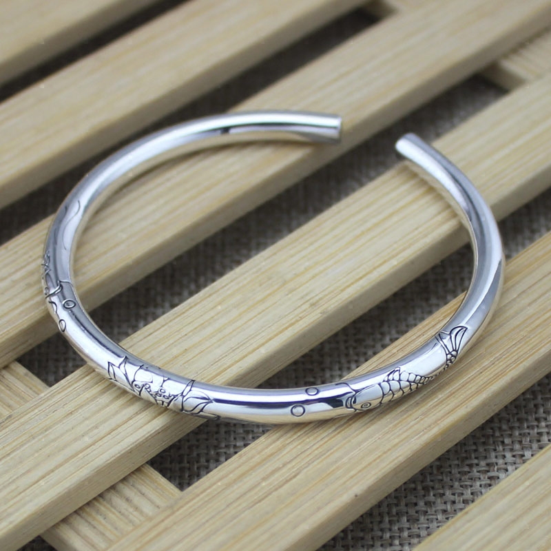 Baishi Silver Cheng silver bracelet fish style sterling silver 999 female open fish lotus lotus silver bracelet retro ethnic style