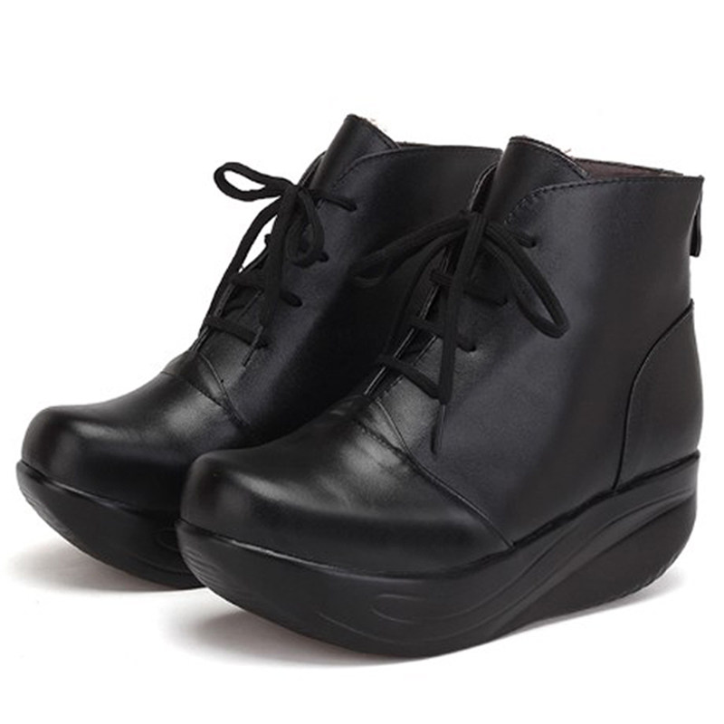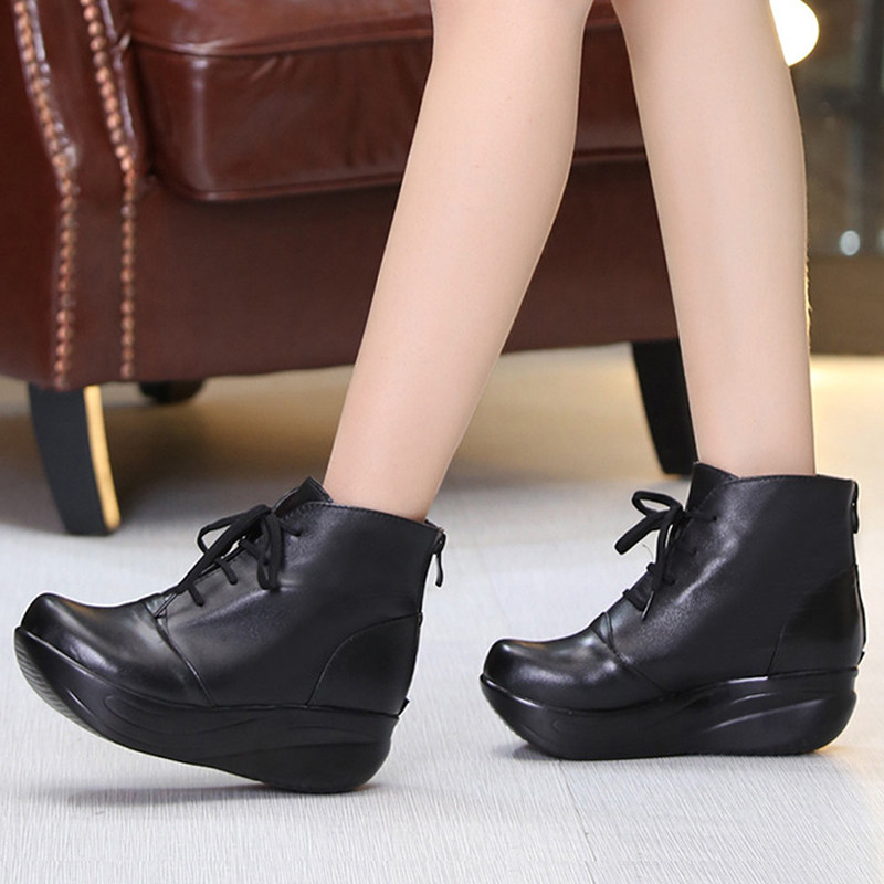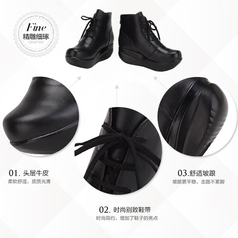 Rocking shoes leather short boots medium heel thick bottom high top plus velvet cotton shoes warm cotton leather boots large size women's shoes 41-43 winter