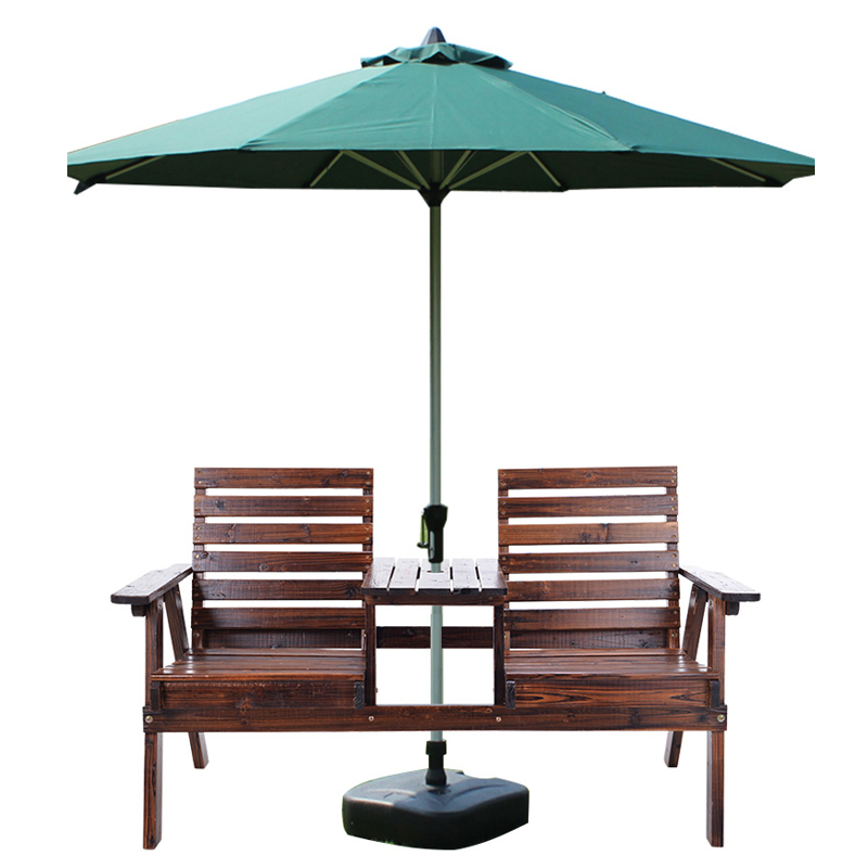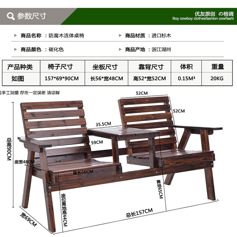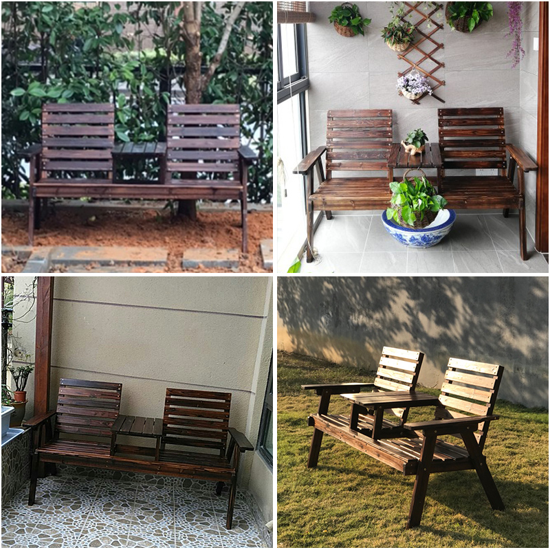 Youyou Outdoor Solid Wood Patio Table And Chairs Charred Embalming Wood Double Leaning Back Chair With Tea Table Park Casual Chair