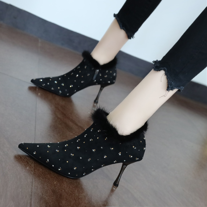 Pointed hair wool high heel shoe woman Winter Korean version 100 lap ankle boot suede fine heel short boot Mink Boots 2020 Fall