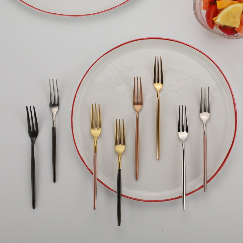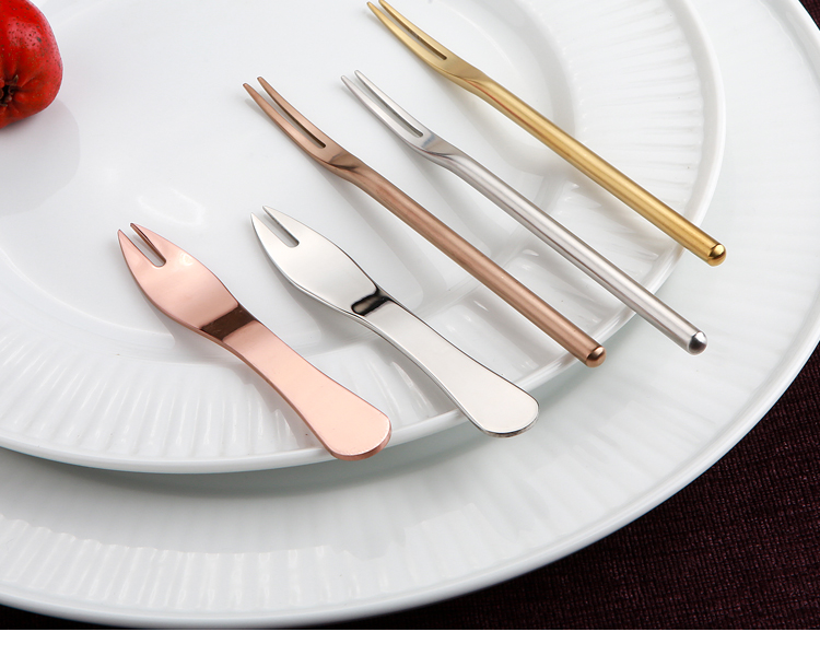 Glossy silver fruit fork A brushed silver fruit fork A glossy gold fruit fork A brushed gold fruit fork a black gold fruit fork a pink gold fruit fork a black silver fruit