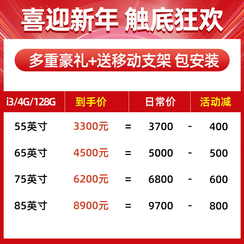 17 inch medium match (I3 4G 120G) 32 inch medium match (I3 4G 120G) 43 inch medium match (I3 4G 120G) 49 inch medium match (I3 4G 120G) 55 inch medium match (I3 4G 120G) 65 inch medium match (I3 4G 120G) 75 inch medium match (I3 4G 120G) 85 inch medium match (I3 4G 120G) 32 inch high match (I5 4G 120G) 43 inch high match (I5 4G 120G) 49 inch high match (I5 4G 120G) 49 inch high match (I5 4G 120G) 55 inch high-end (I5 4G 120G) 65-inch high-end (I5 4G 120G) 75-inch high-end (I5 4G 120G) 85-inch high-end (I5 4G 120G) 55-inch top-up (I7 4G 120G) 55-inch dual-system 65-inch top-matching (I7 4G 120G) 65-inch dual-system 75-inch top-matching (I7 4G 120G) 75-inch dual-system 85-inch top-matching (I7 4G 120G) 85-inch dual-system 98-inch dual system