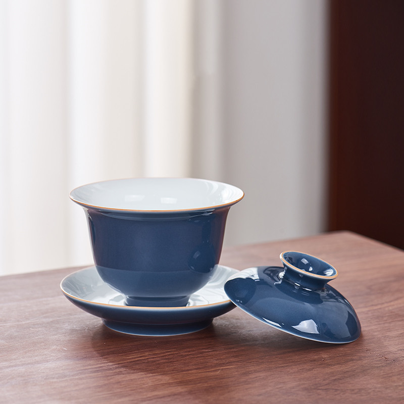 Jingdezhen Gaiwan Teacup Ceramic Kung Fu Tea Set Tea Bowl Sancai Bowl Large Sacrificial Blue and White Porcelain Hand-painted Gaiwan