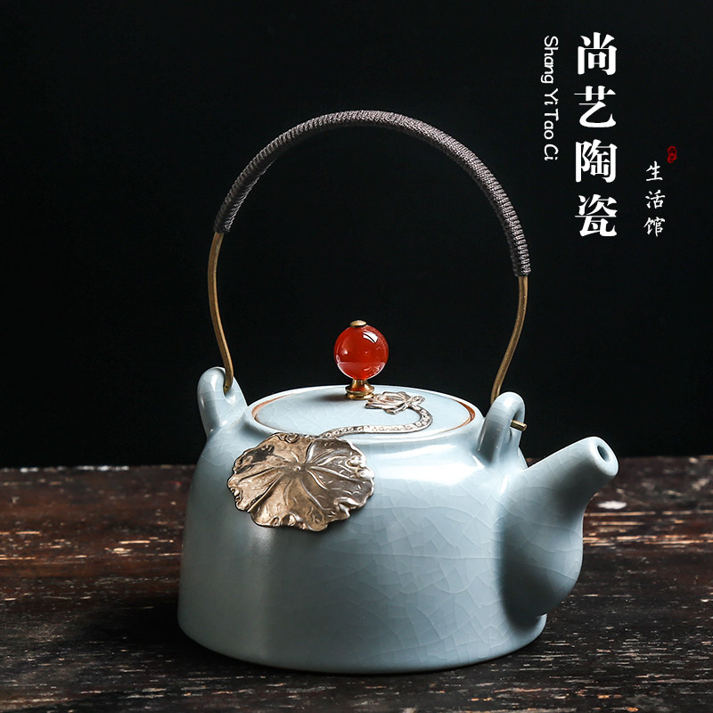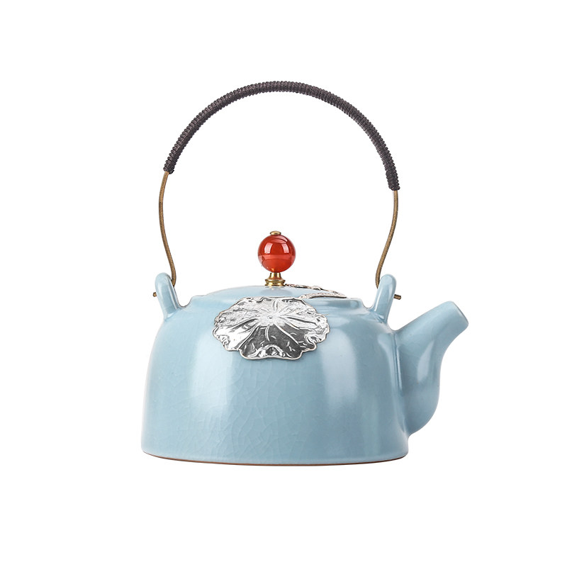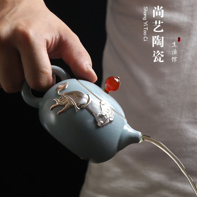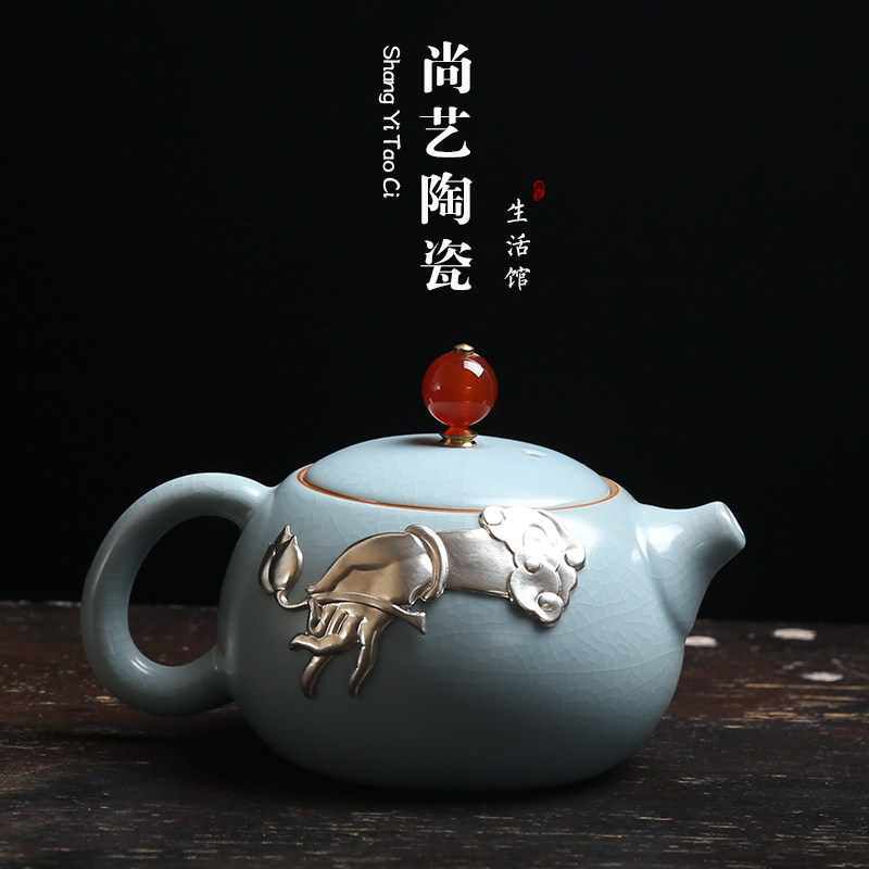 Ru kiln pure handmade silver teapot Japanese style open piece Ru porcelain tea maker ceramic beam pot kung fu tea set single pot