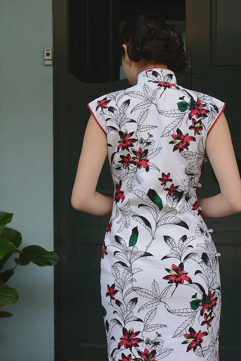 Momo Small Sleeves Half Cardigan Double Inlaid Long Printed Linen Cheongsam To Oak