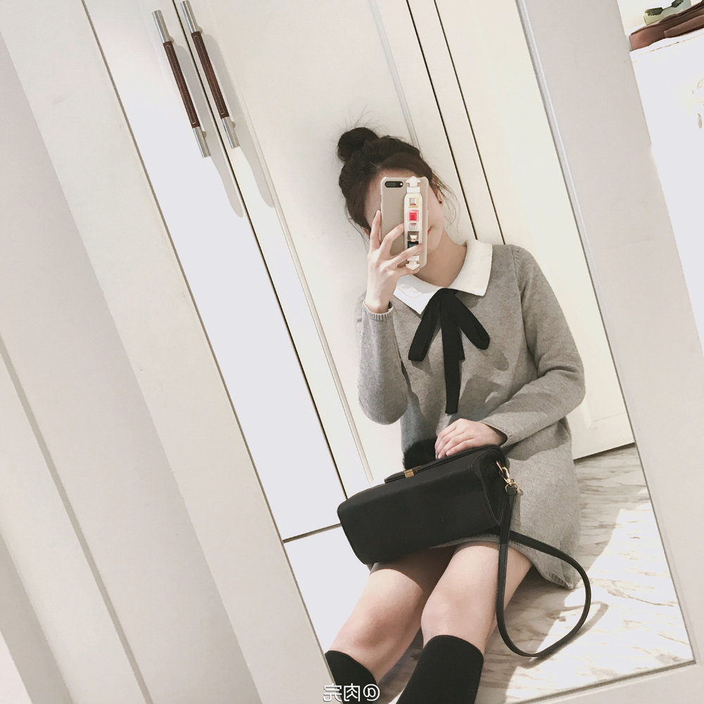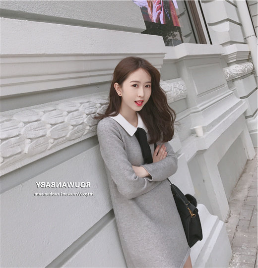 2020 new bow knitted dress autumn and winter sweater dress medium and long version of female student winter base doll skirt