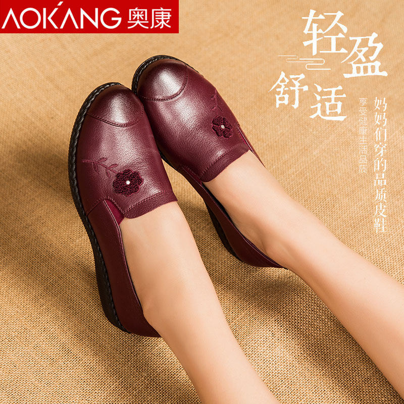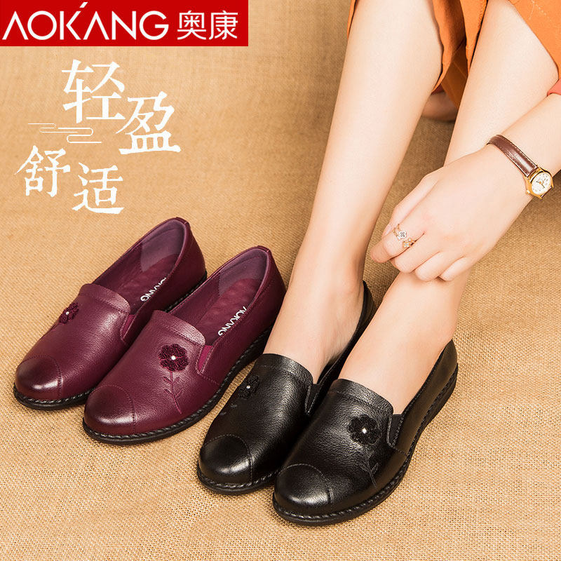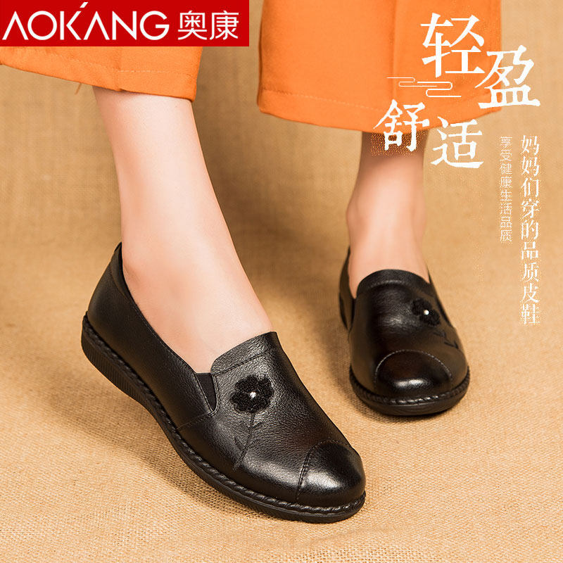 Aokang spring and autumn mother shoes single shoes soft bottom flat casual leather shoes women's leather comfortable middle-aged and elderly women's leather shoes