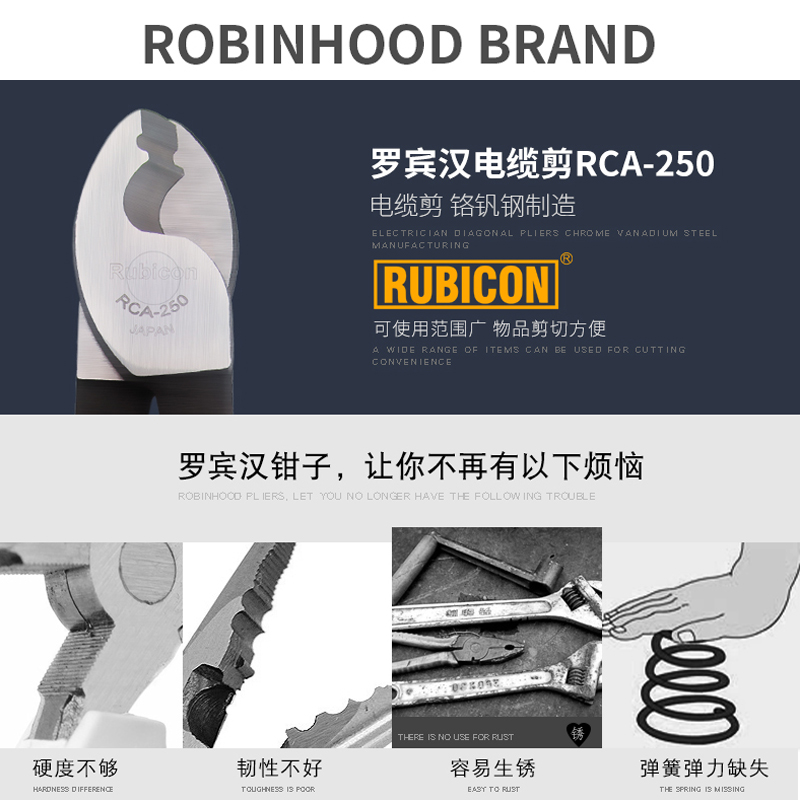 6-inch cable pliers (RCA-150) suitable for shearing multi-strand cords (strictly forbidden to cut single strands) 8 inch cable pliers (RCA-200) suitable for shearing multi-strand cords (strictly forbidden to cut single