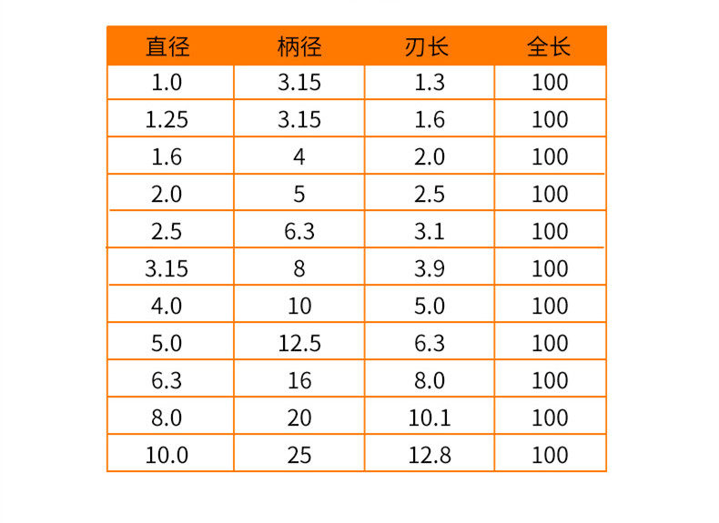 Straight shank *shank diameter* total length 1*4*1001.5*5*1002*5*1002.5*6*1003*8*1003.5*8*1004*10*1005*12*1006*14*1008*20*10010*20*1002*5*1502.5*6*1503*8*1504*10*1505*12*1506*14*1502*5*2002.5*6*2003*8* 2004*10*2005*12*2006*14*200
