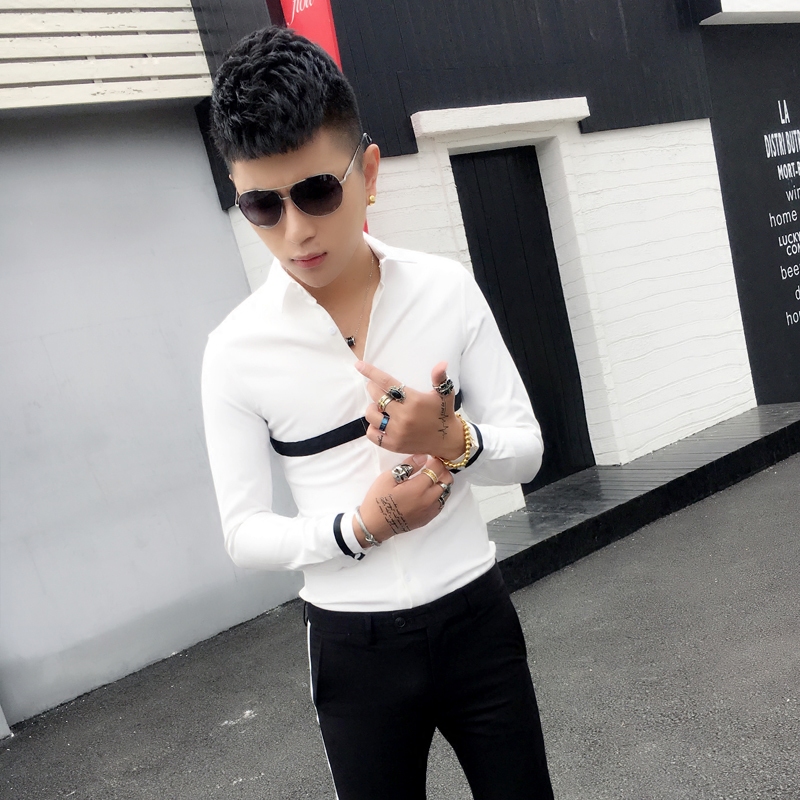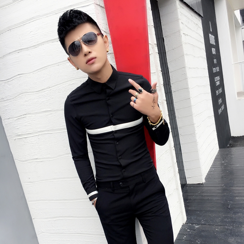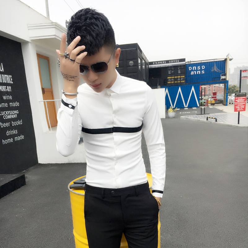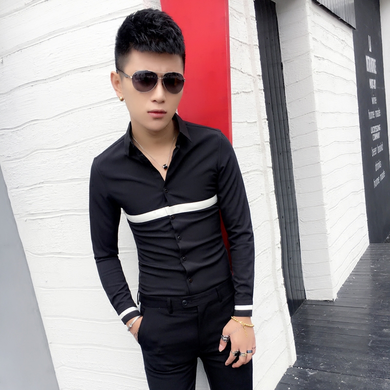 Color-blocking tight-fitting small size close-fitting long-sleeved shirt slim youth Korean style hair stylist casual trend fashion shirt