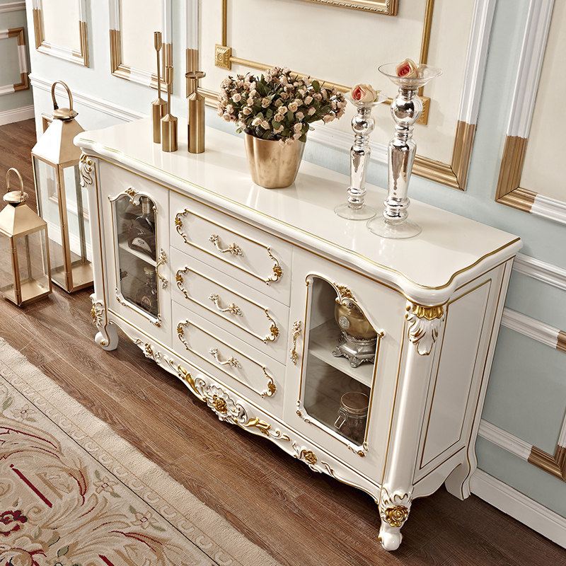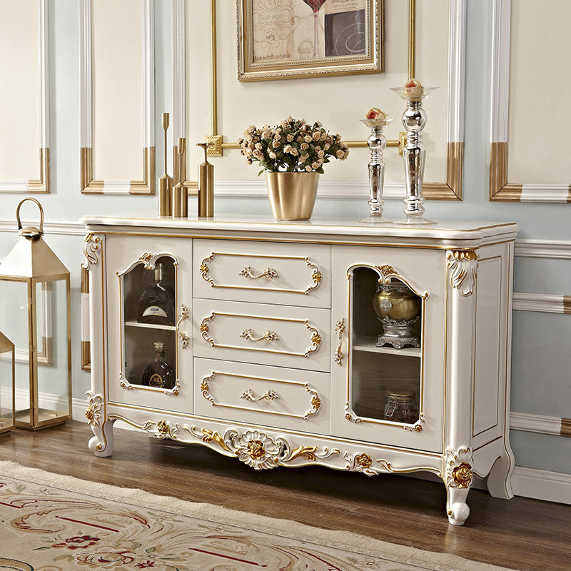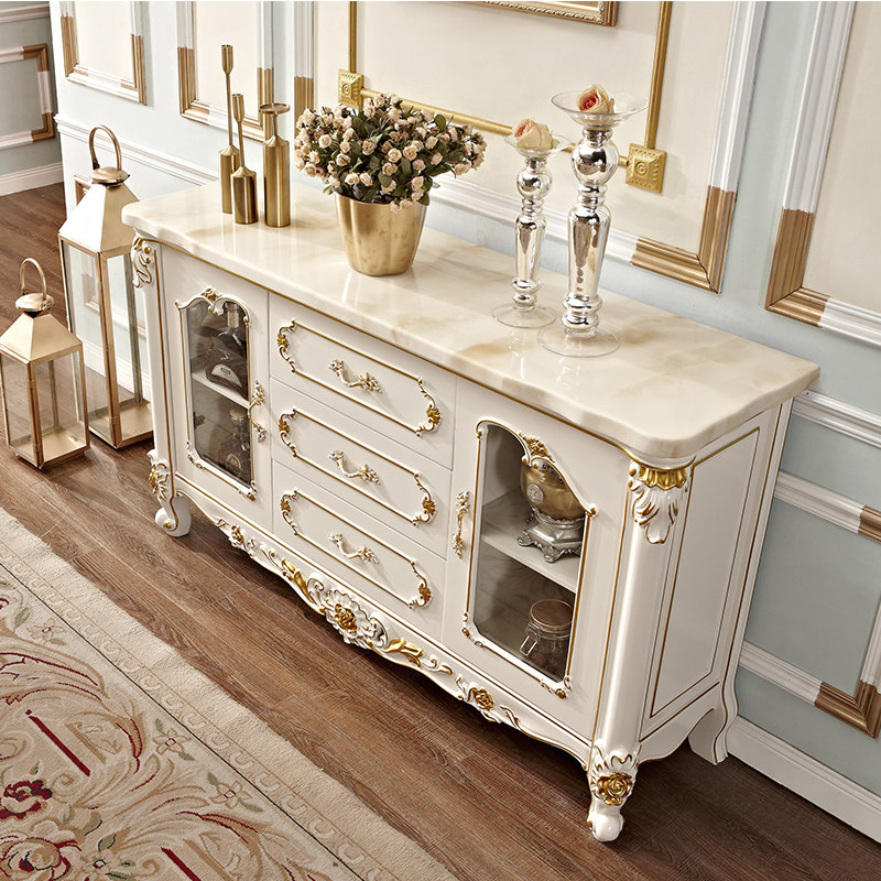 European-style solid wood dining cabinet white marble kitchen wall tea cabinet hand-carved glass door storage cabinet