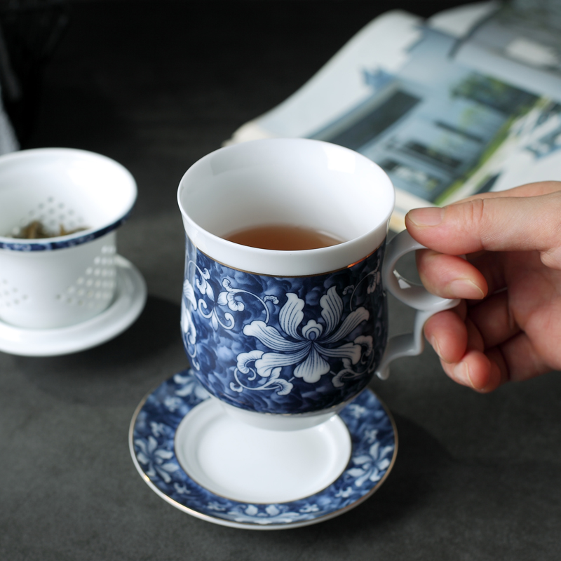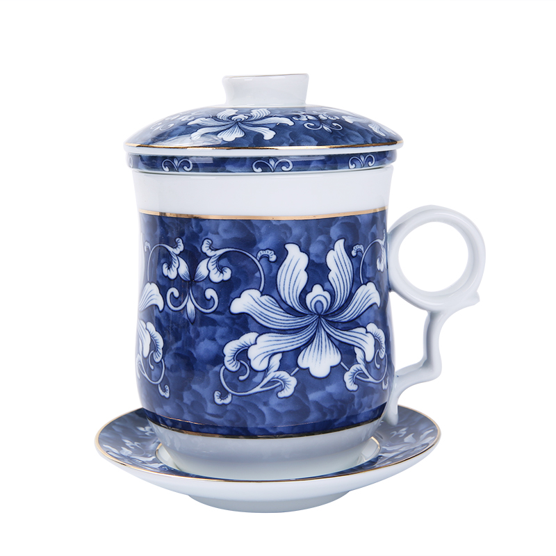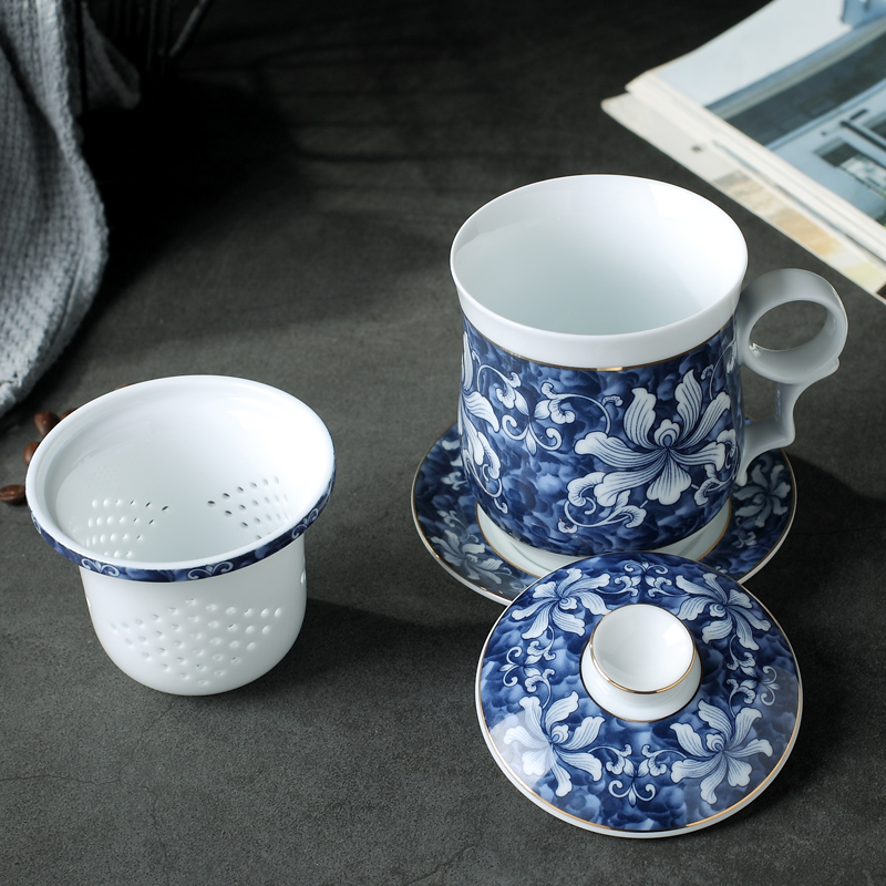 Blue and white gold Jingdezhen tea set Tea cup Ceramic with lid filter tea four-piece set Home office gift cup
