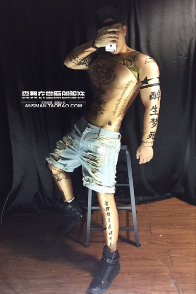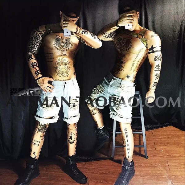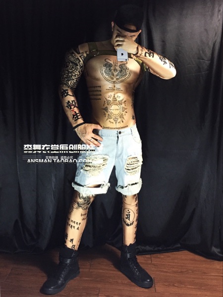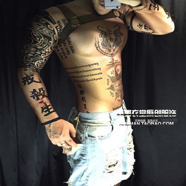 Bar nightclub male singer dj gogo 3D fake muscle ABS Sanskrit Chinese one-piece tattoo costume