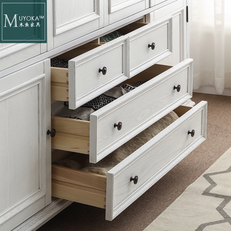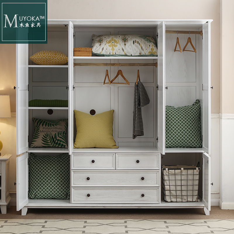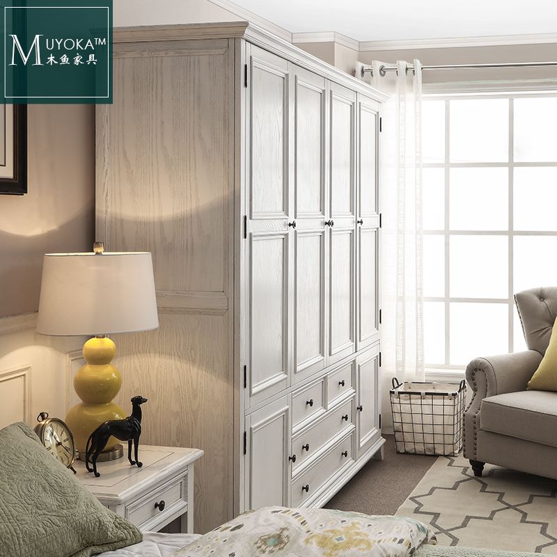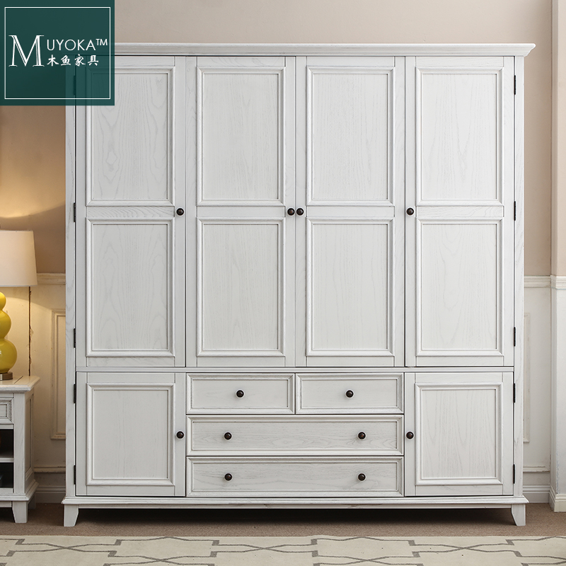 American Countryside Solid Wood Four Doors Wardrobe Wood Fish Furniture Furniture White Waxy Wood Big Wardrobe American Wardrobe Top Cabinet White Solid Wood