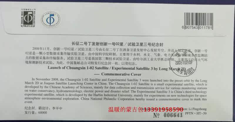 Head Office Space Series 59 Souvenir Cover (Long March 2 Ding Rocket Launch Innovation 1 Satellite Memorial)