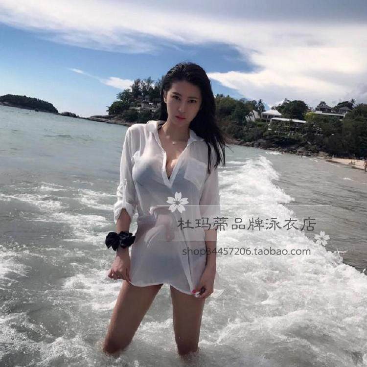 Island vacation wear white BF long-sleeved shirt bikini swimsuit beach jacket chic blouse sun protection clothing women