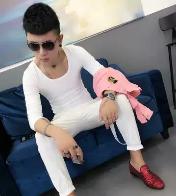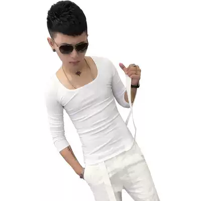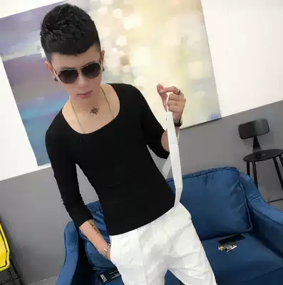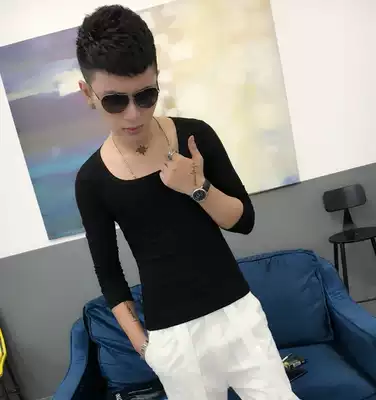 Low-collar youth fashion solid color T-shirt Korean version of slim fitting men's big round collar clothes Tide tight inside