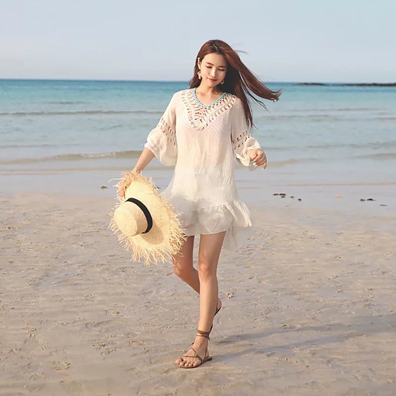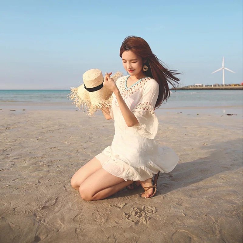 South Korean dew-back lacing beach jacket with long version hollowed-out sunscreen sexy bikini swimsuit hood seaside hood skirt