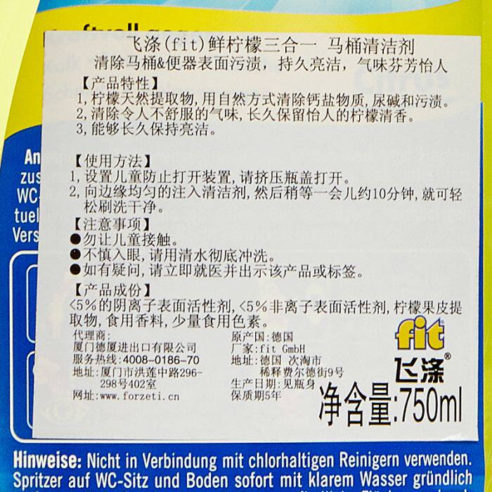 fit (Flying Di) Germany imported toilet cleaning agent cleaning toilet spirit fresh lemon three-in-one toilet cleaner 750ml