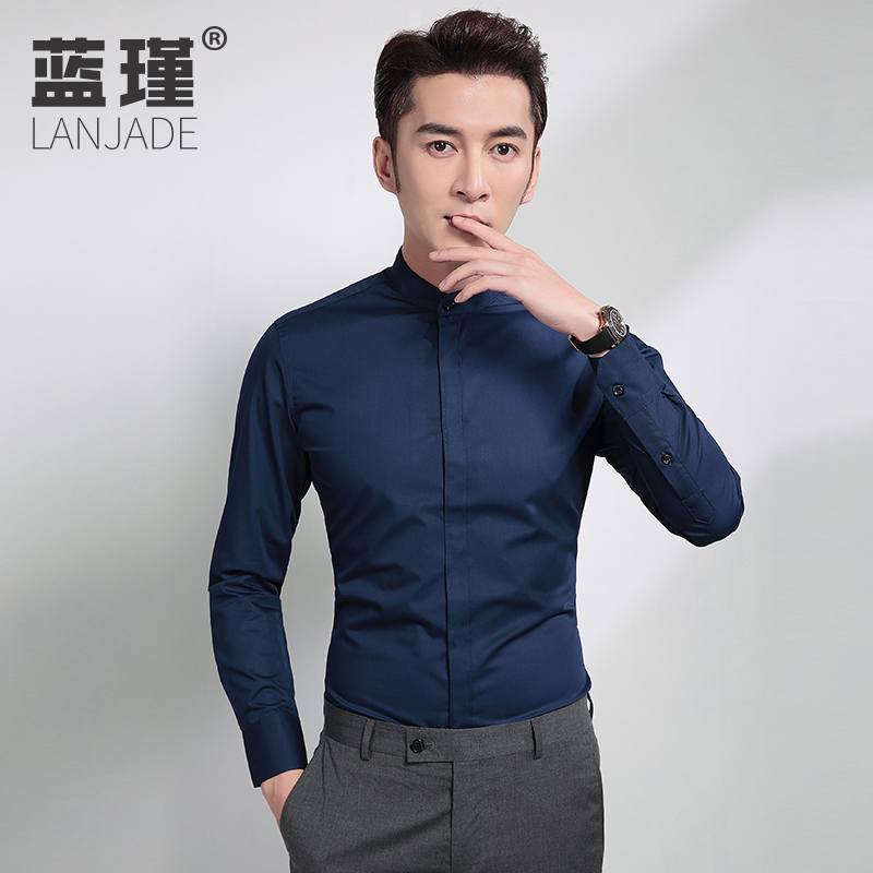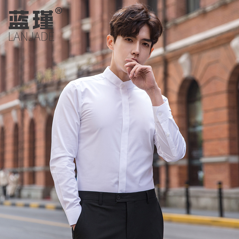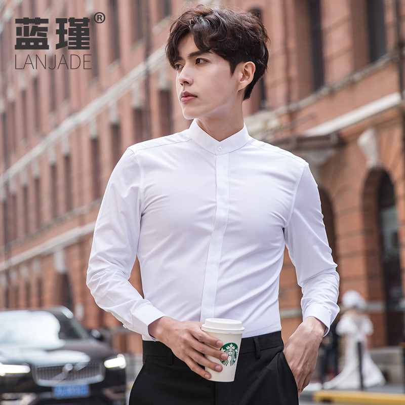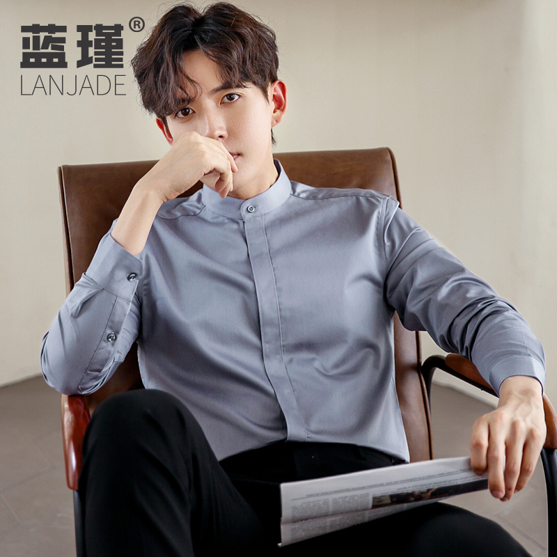White collar shirt men's long sleeve autumn youth business no round neck slim shirt dress solid color overalls inch