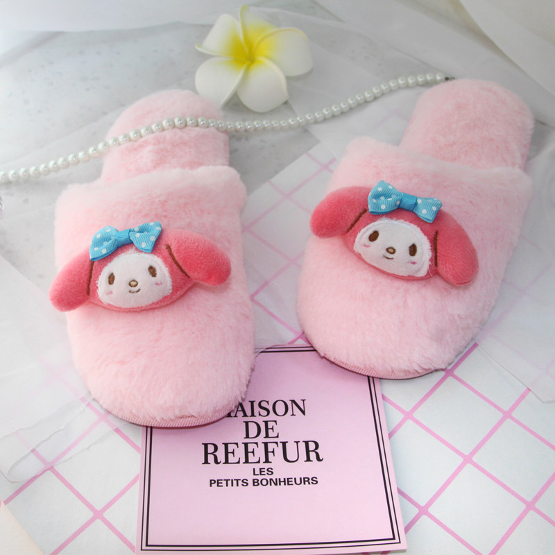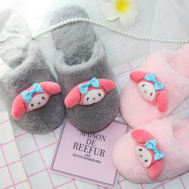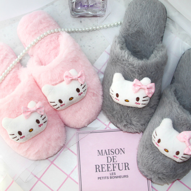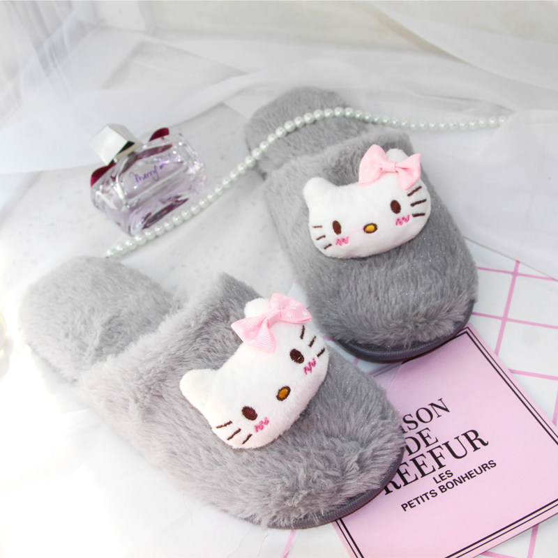 Spring and autumn and winter women cute cartoon sweet K*T cat imitation rabbit hair non-slip waterproof warm home cotton slippers