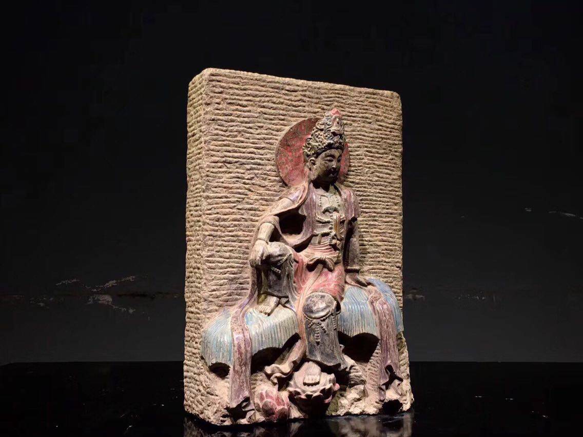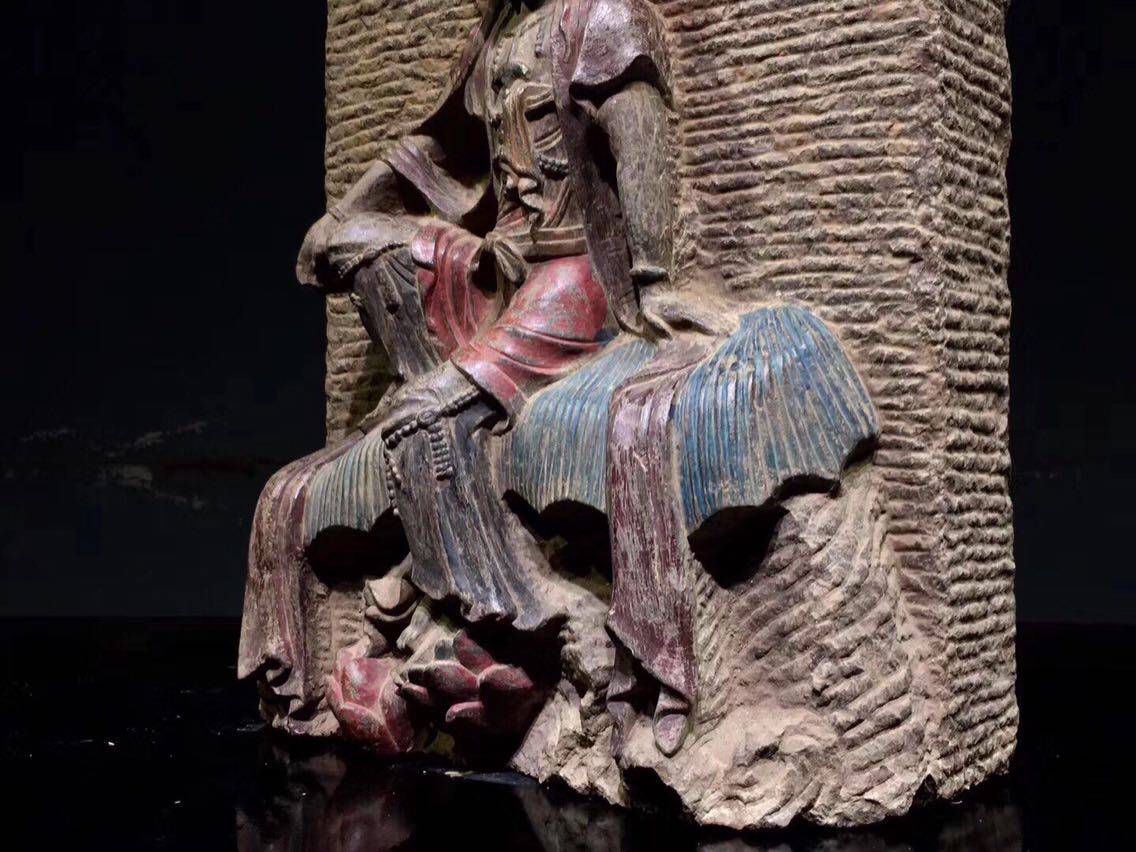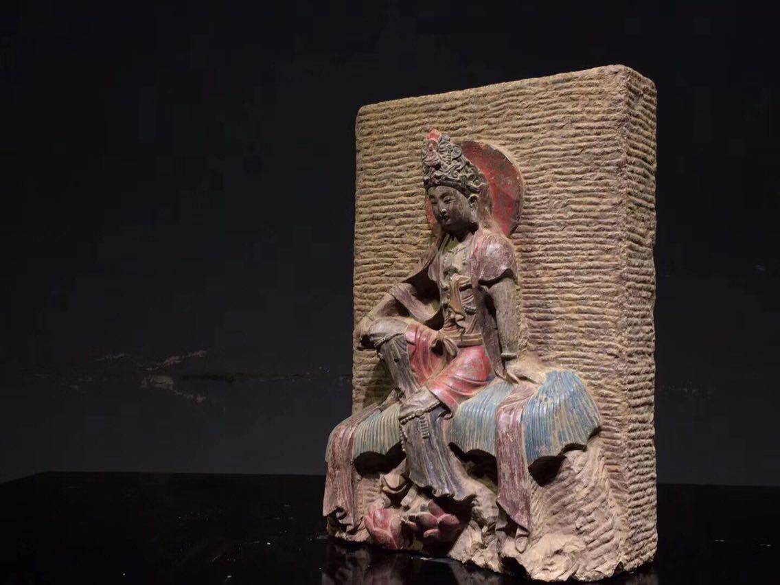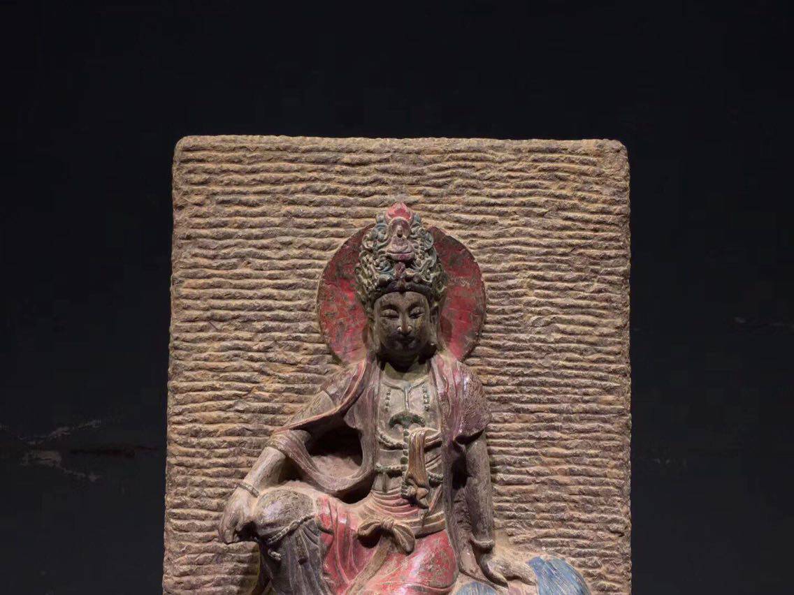 (at ease in Guanyin) Qingshi color painted high 52 meters wide 36 thick 18 cm open face Cixiang wearing a flower crown