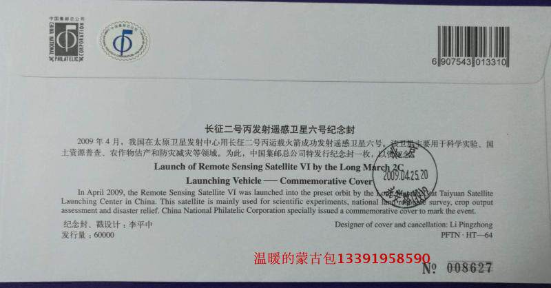 Head Office Space Series 64 Souvenir Cover (Long March 2 Rocket Launch Remote Sensing 6 Satellite Remembrance)