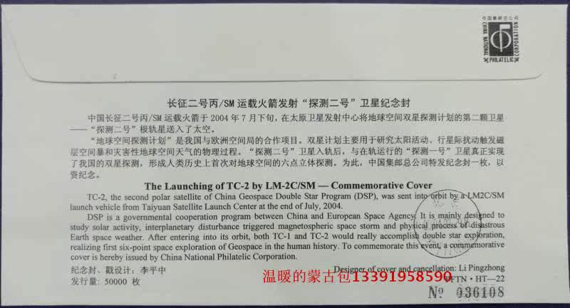 Head office space series 22 Souvenir Cover (Long March 2 Proper rocket launch detection 2 satellite commemoration)