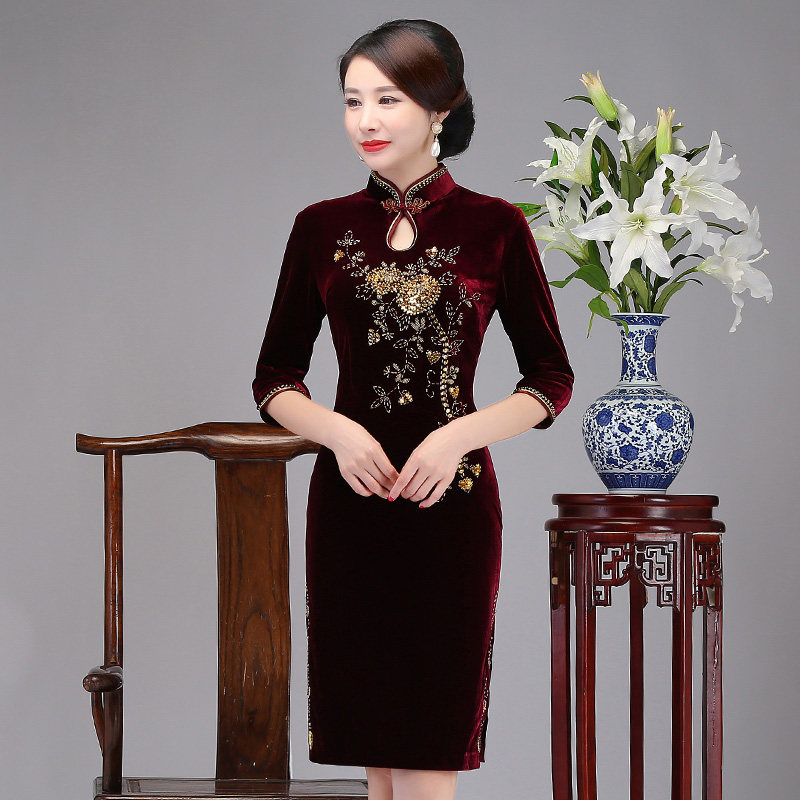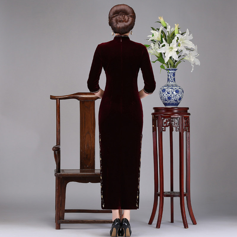Middle-aged and elderly mother wedding golden velvet improved cheongsam 2021 new autumn winter thick mother-in-law banquet dress