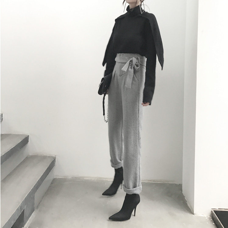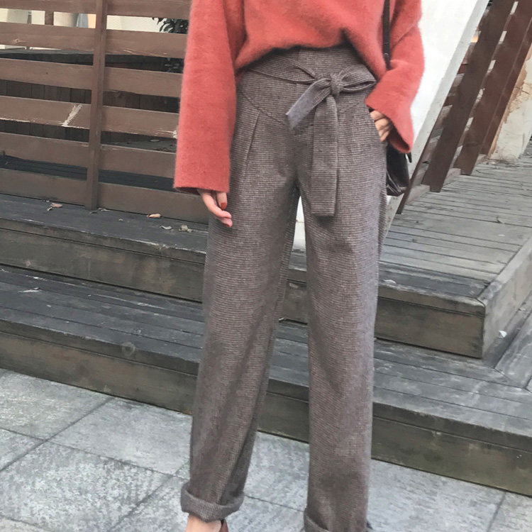 (LAMOBO exclusive) retro high waist belt herringbone textured straight cylinder curl wool, Western pants