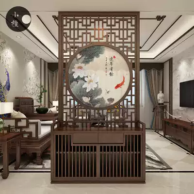 New Chinese style screen partition living room solid wood home carving hollow through the top floor entrance cabinet flower and bird calligraphy and painting screen
