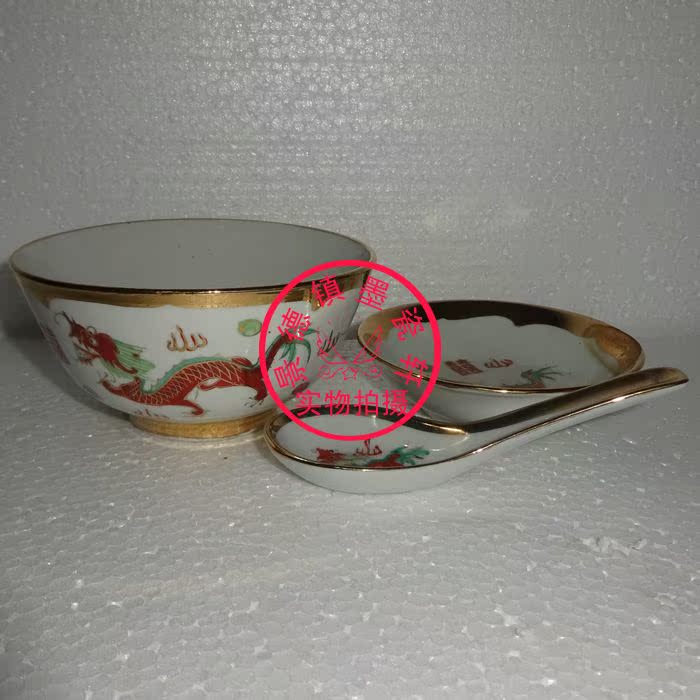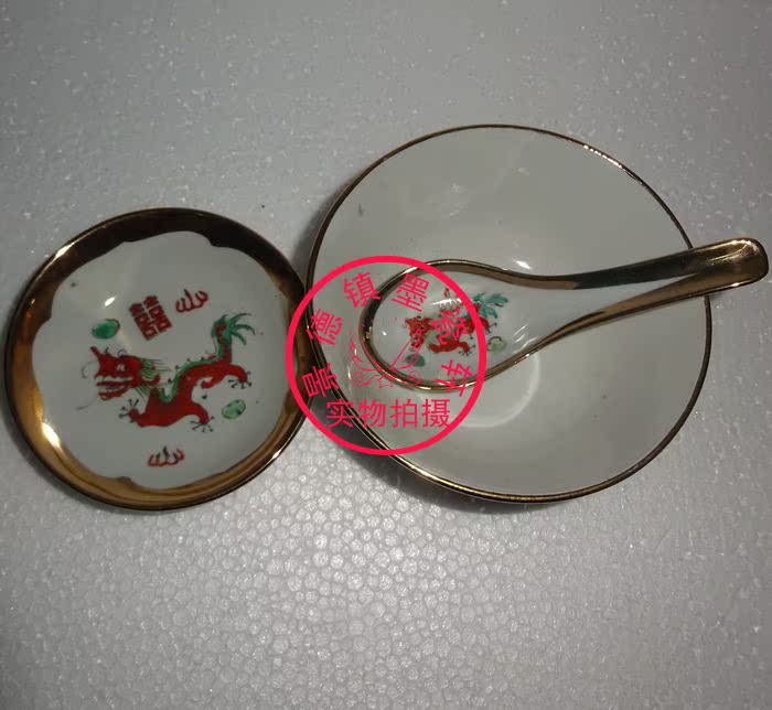 Jingdezhen Cultural Revolution factory goods porcelain pastel hand-painted Golden Doufang Dragon and Phoenix double happiness Three-headed rice set table tableware