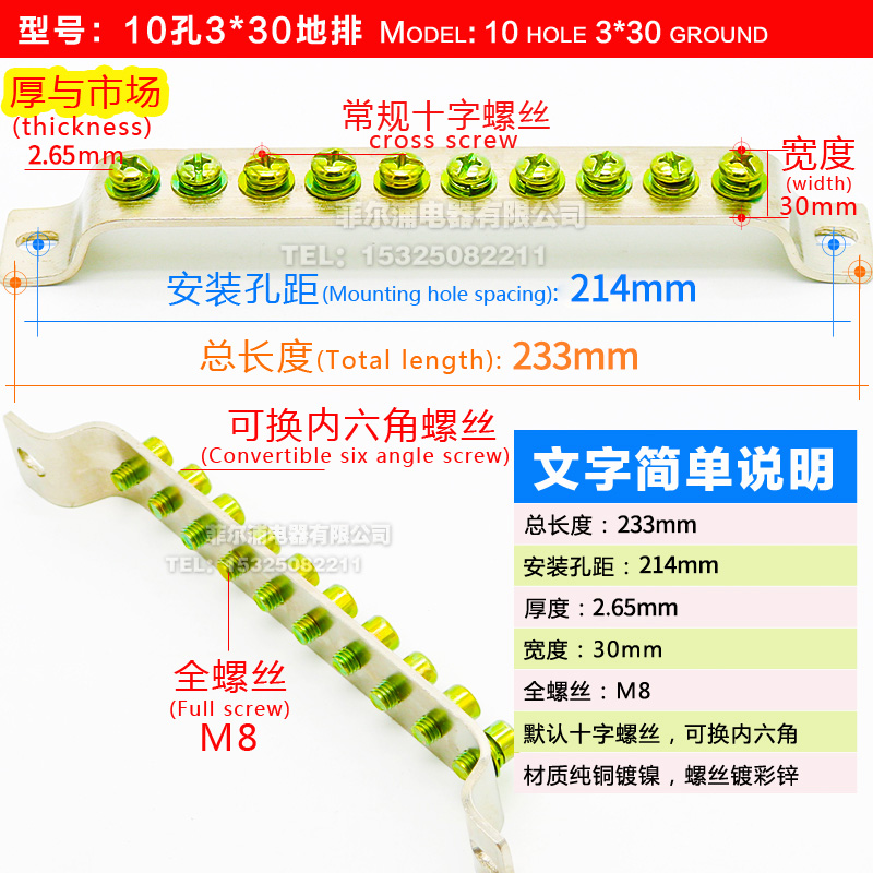 Direct sales 10-hole ground row 3*30 zero ground row 30 wide distribution box thickened and widened ground wire terminal copper bar row