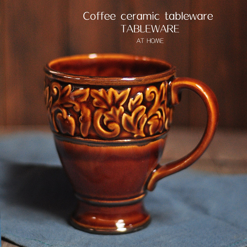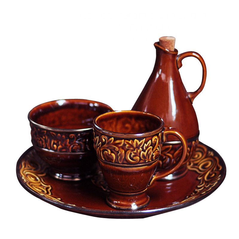 Export single retro ancient relief Coffee color European-style Western-style cutlery High-end Ceramic Suit Big Long Disc Mug Bowl Oil Pot
