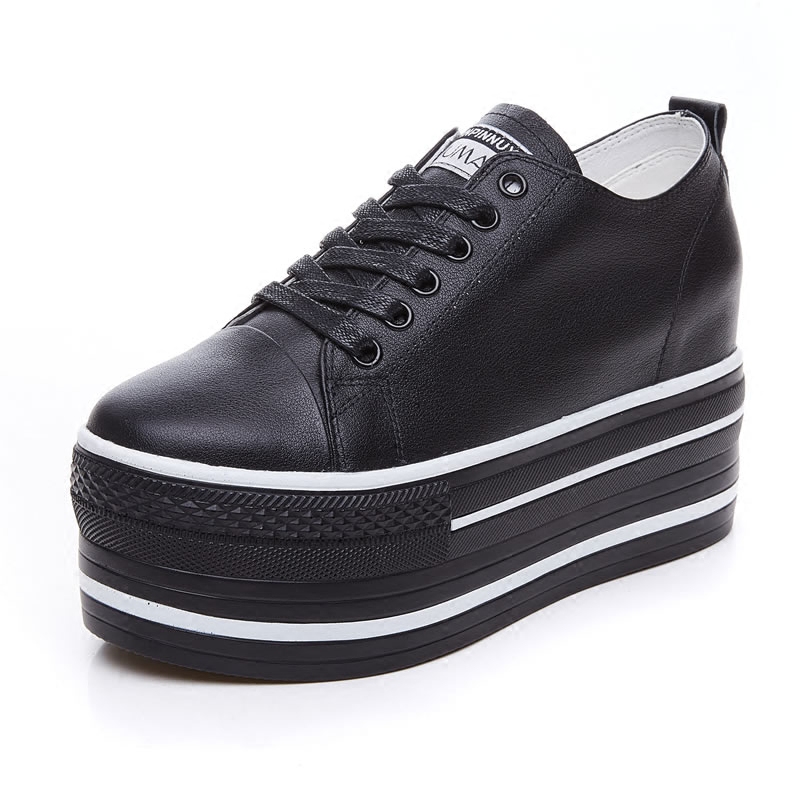 Spring new thick bottom pine pastry inner heightening plate shoes genuine leather casual shoes Han version 100 lap lace black single shoe woman