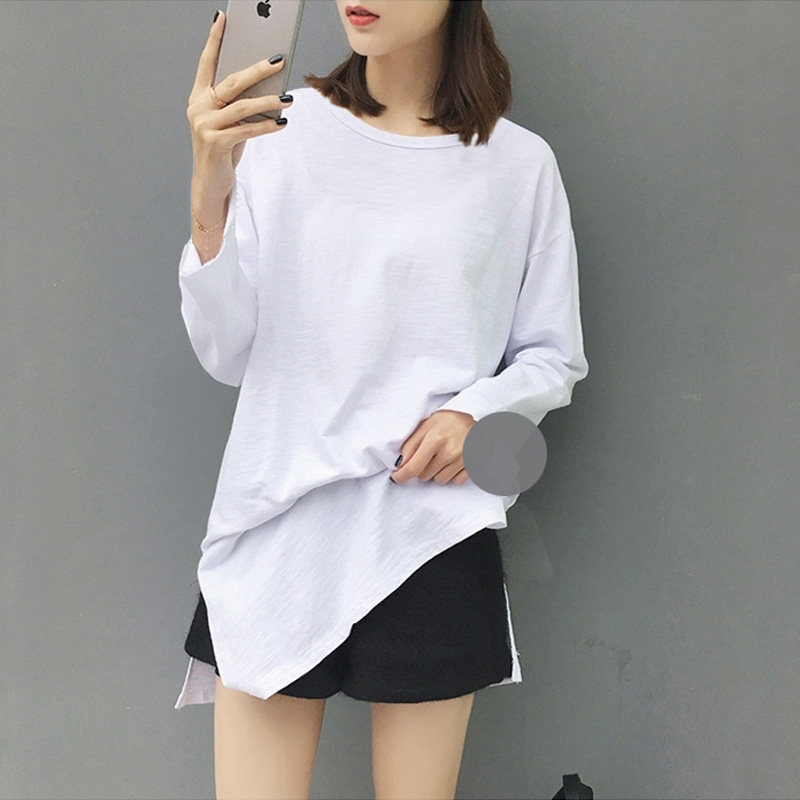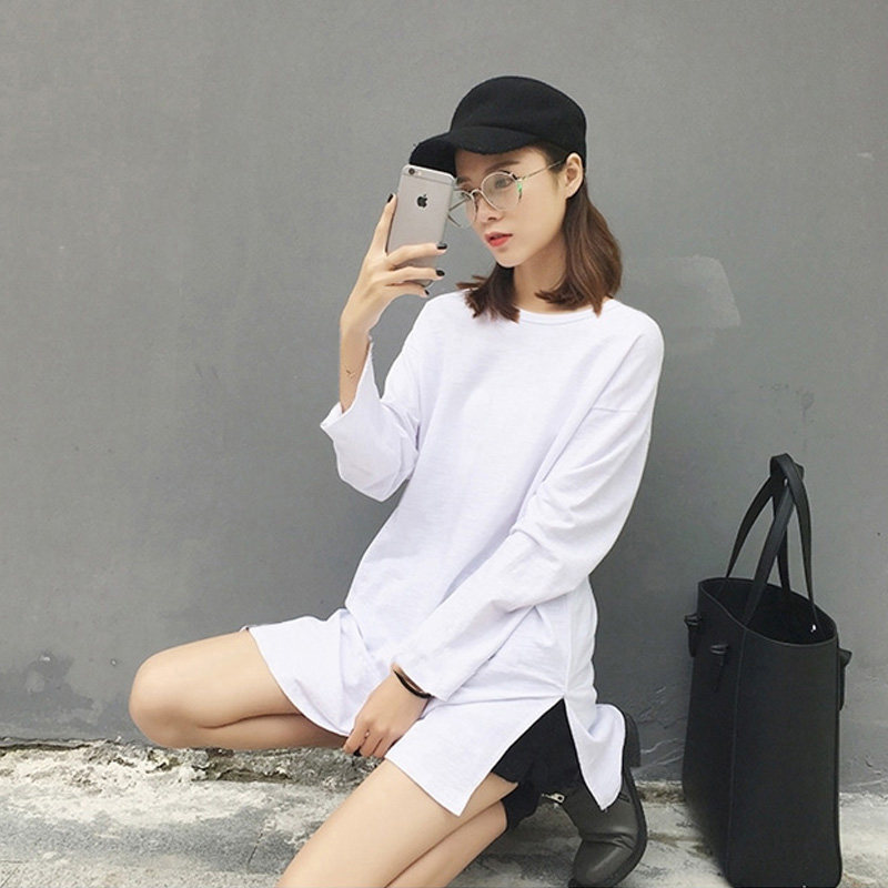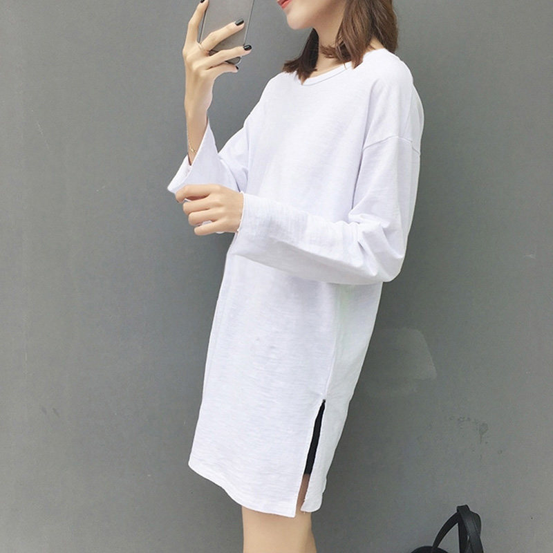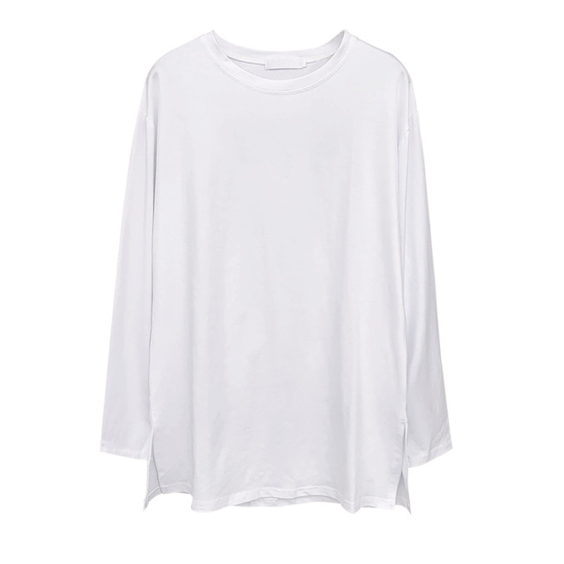 Women's clothing T-shirt loose side open fork 100 hitch casual spring dress Long sleeves 2021 new outwear medium long version pure cotton T-shirt
