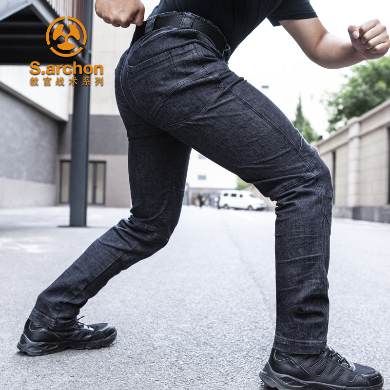 Outdoor Tactical Long Pants Spring Autumn Season Men's Elastic Jeans Tight Waist Straight Cylinder Loose Casual Work Suit Pants Black Blue
