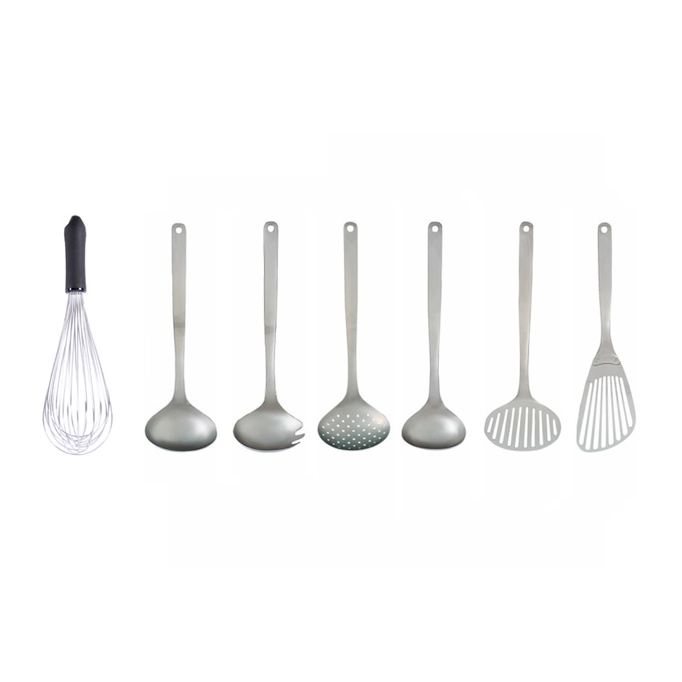 Food clip Non-porous Food clip Perforated whisk Mixing shovel Spatula Large colander Large fork spoon Spoon Large spoon Medium spoon Small colander Small spatula small