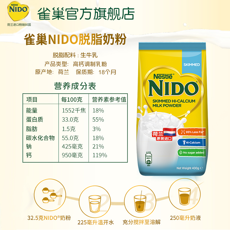 (Flagship Store) Nestle Holland Imported nido Defatted High Calcium Women Adult Milk Powder * 2 Bags