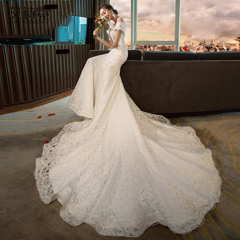 One-word shoulder fishtail wedding dress 2020 new small tail bride Hepburn thin net red simple white 2021