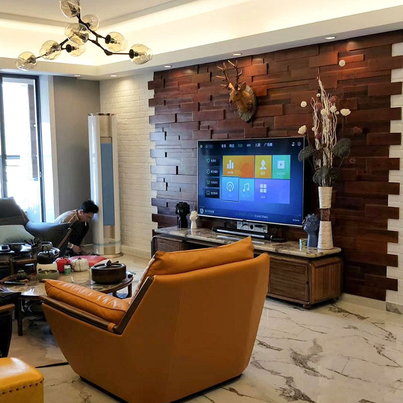 Solid wood mosaic TV background wall log decoration materials coffee shop tea room storefront living room modern minimalist decoration