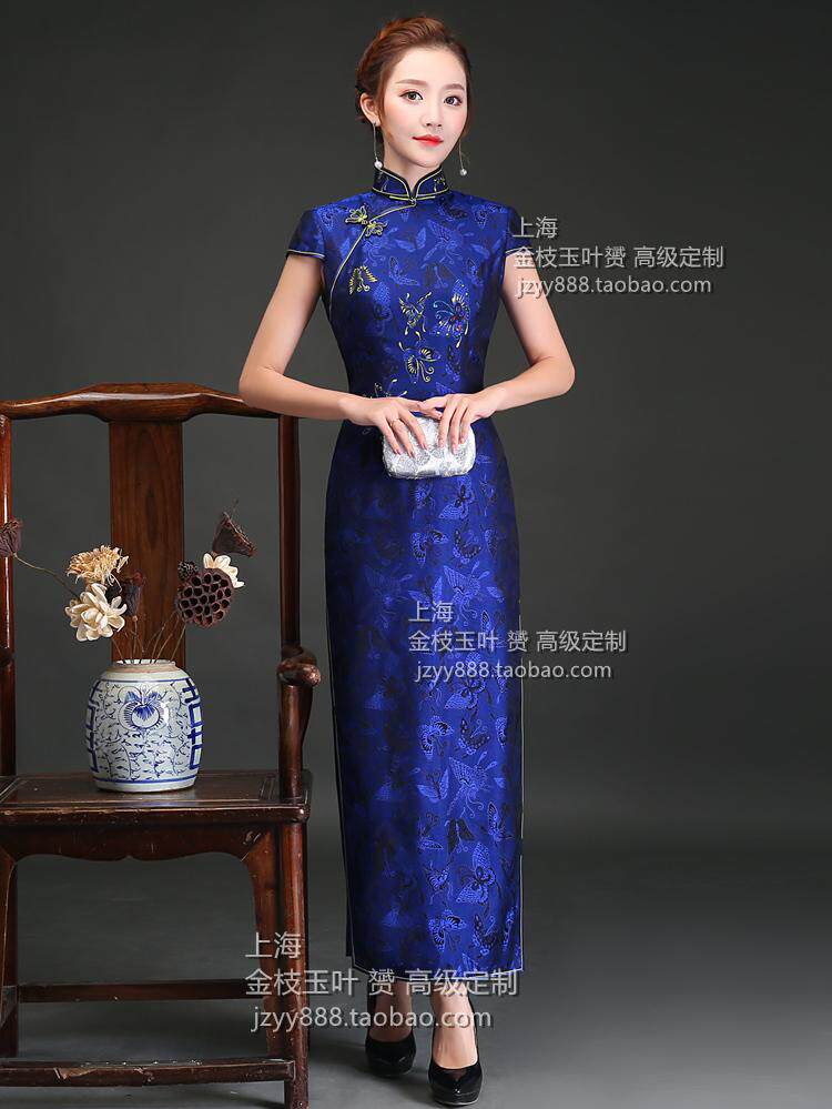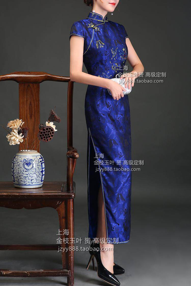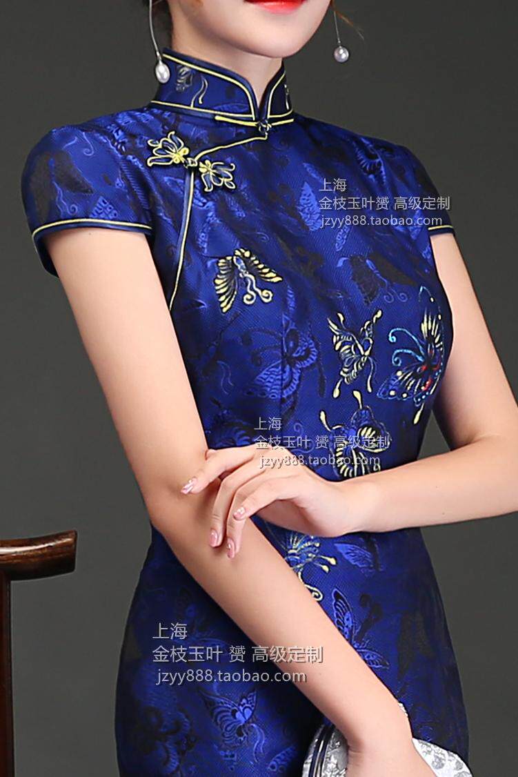 Light and luxurious tune with 3D jacquard genuine silk color gold hand painted butterfly long qipao high-end set for spring and autumn qipao
