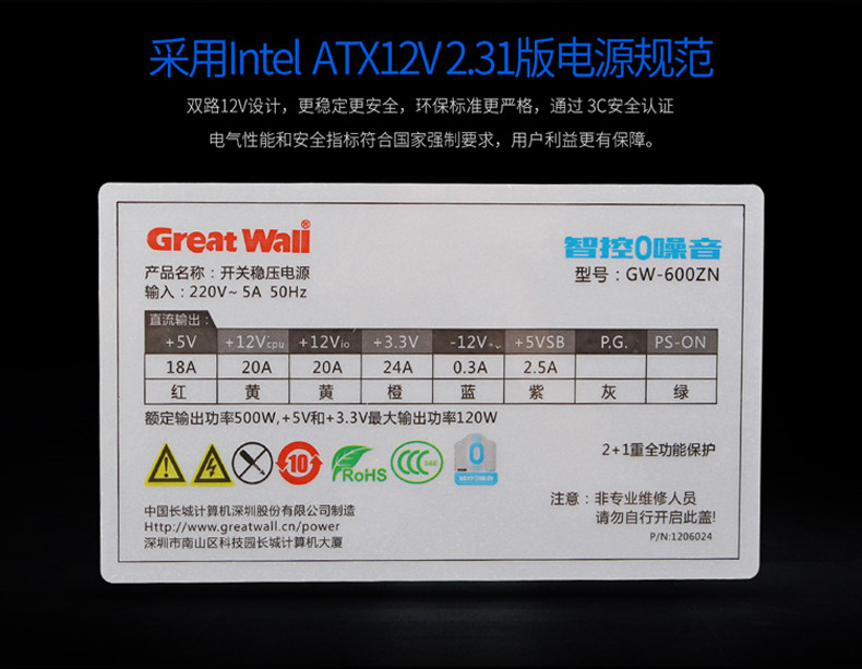 Great Wall GW-600ZN rated 500W computer power table top computer back line wise control 0 decibel mute power brand new